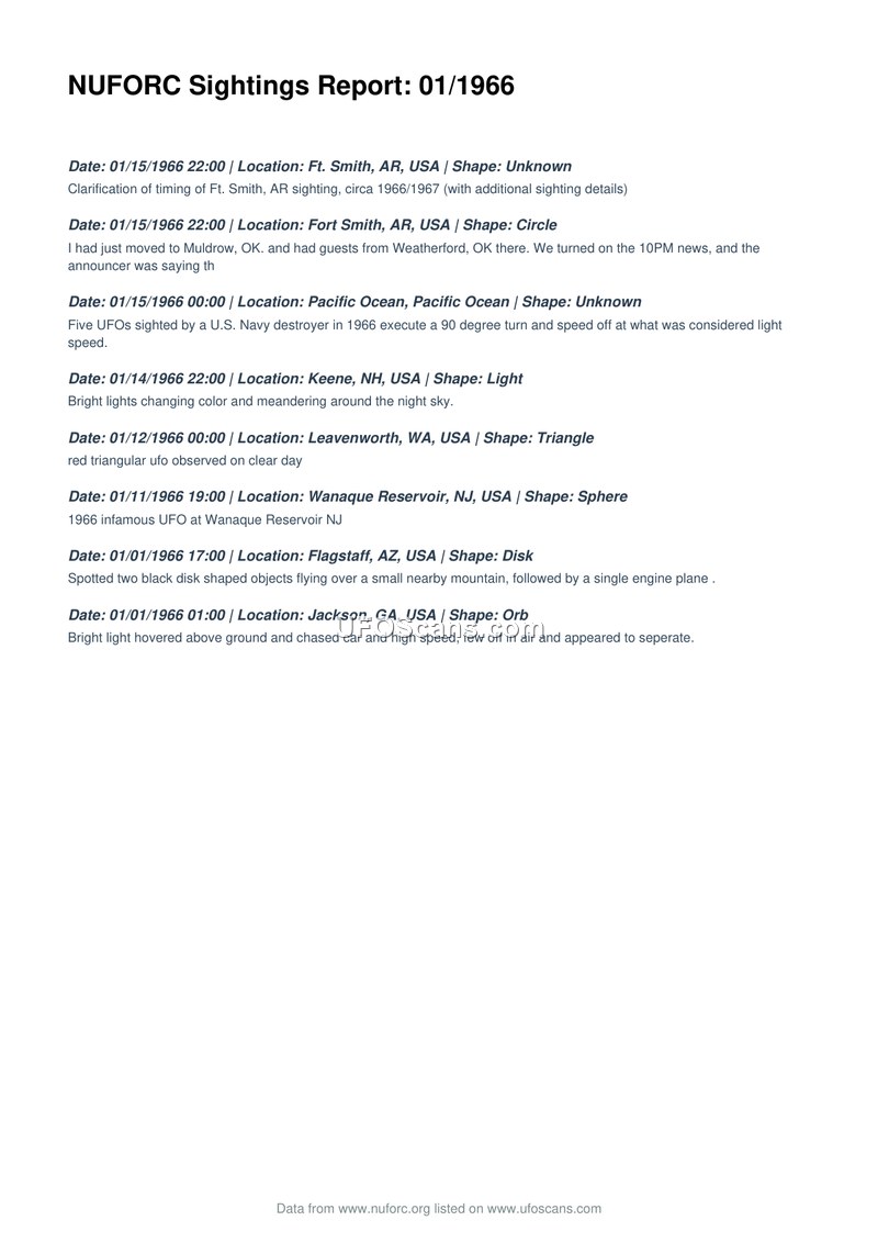 This document is a compilation of UFO sightings reported to the National UFO Reporting Center (NUFORC) for the month of January 1966. The report lists eight distinct incidents occurring across the United States and the Pacific Ocean. The sightings include a variety of phenomena, such as a circle-shaped object in Fort Smith, Arkansas; five unidentified objects observed by a U.S. Navy destroyer in the Pacific Ocean that performed a 90-degree turn and moved at light speed; bright lights in Keene, New Hampshire; a red triangular object in Leavenworth, Washington; a sphere at the Wanaque Reservoir in New Jersey; two black disk-shaped objects in Flagstaff, Arizona; and an orb in Jackson, Georgia, that reportedly chased a car. The document serves as a chronological log of these events, providing dates, times, locations, and brief descriptions of the observed shapes and behaviors.
