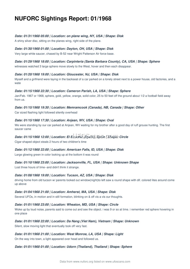 This document is a compilation of UFO sightings reported to the National UFO Reporting Center (NUFORC) for the month of January 1968. The report lists 18 distinct incidents occurring across various global locations, including the United States, Canada, Spain, Vietnam, and Thailand. The sightings describe a variety of phenomena, ranging from disks, spheres, and circles to cigar-shaped objects and unidentified lights. Notable reports include a shiny silver disc observed on a plane wing in New York, a large white saucer chased by a B-52 near Wright-Patterson Air Force Base in Ohio, and a cigar-shaped object in Spain that allegedly caused two children to lose two hours of time. Other reports involve witnesses experiencing missing time, such as in Jacksonville, Florida, and observations of silent, fast-moving lights or objects hovering near military installations, such as a zig-zagging light over a USAF Air Base in Thailand. The descriptions provided by witnesses vary from simple visual sightings of lights to more complex encounters involving physical objects and potential temporal anomalies.