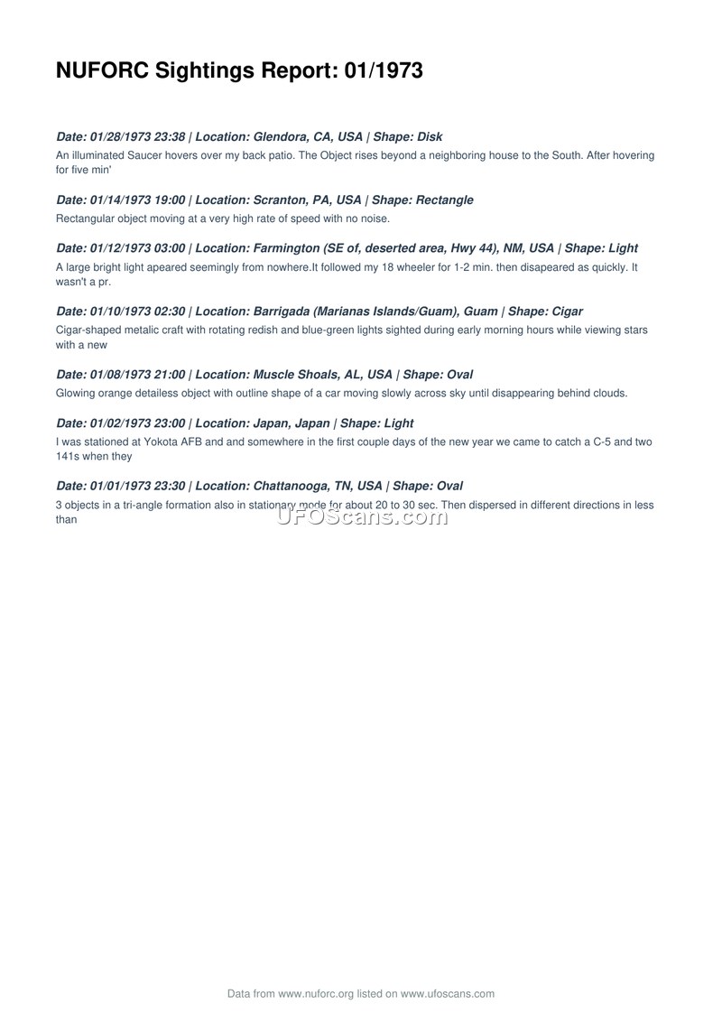 This document is a compilation of seven UFO sighting reports from January 1973, curated by the National UFO Reporting Center (NUFORC). The reports span various locations, including Glendora, California; Scranton, Pennsylvania; Farmington, New Mexico; Barrigada, Guam; Muscle Shoals, Alabama; Japan; and Chattanooga, Tennessee. The sightings describe a variety of phenomena, including an illuminated saucer, a rectangular object moving at high speed, a large bright light following an 18-wheeler, a cigar-shaped metallic craft with rotating lights, a glowing orange object, an unidentified event involving military aircraft at Yokota AFB, and three objects in a triangular formation. The reports provide brief, anecdotal accounts of these encounters, noting characteristics such as shape, movement, and duration, though they lack formal investigative conclusions.