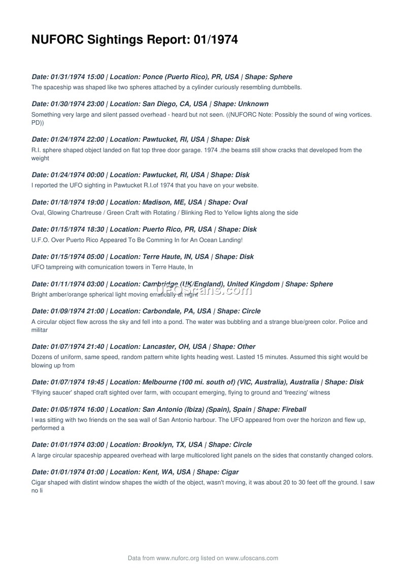 NUFORC Sightings Report: 01/1974