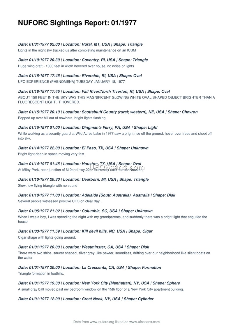 NUFORC Sightings Report: 01/1977