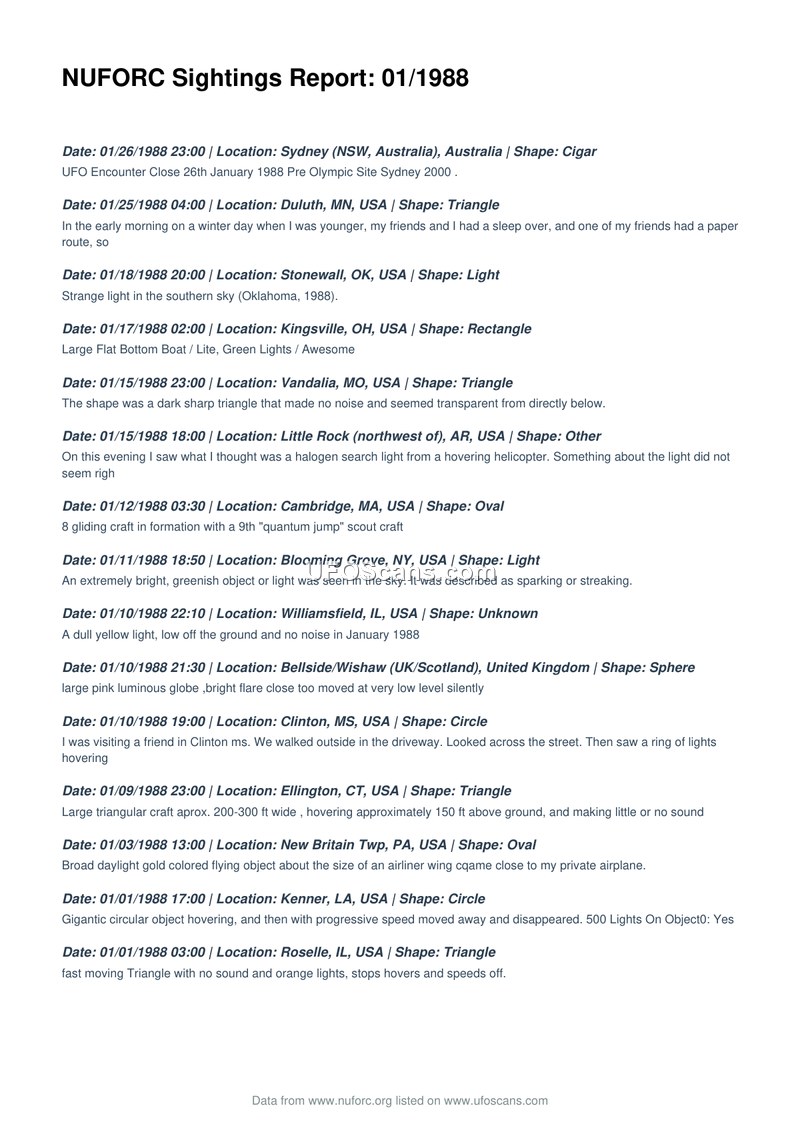 This document is a compilation of UFO sightings reported to the National UFO Reporting Center (NUFORC) during the month of January 1988. The report lists fifteen distinct incidents occurring between January 1st and January 26th, 1988. The sightings span various locations, including the United States, Australia, and the United Kingdom. The reported phenomena vary significantly in description, ranging from cigar-shaped objects, triangles, and spheres to circular objects and lights. Specific details provided by witnesses include observations of a 'quantum jump' scout craft in Cambridge, Massachusetts, a large flat-bottomed boat-like object in Kingsville, Ohio, and a ring of hovering lights in Clinton, Mississippi. Several reports emphasize the lack of sound associated with the objects, while others describe specific maneuvers, such as hovering, rapid acceleration, and formation flying. The document serves as a chronological record of these anecdotal accounts as collected by the NUFORC.