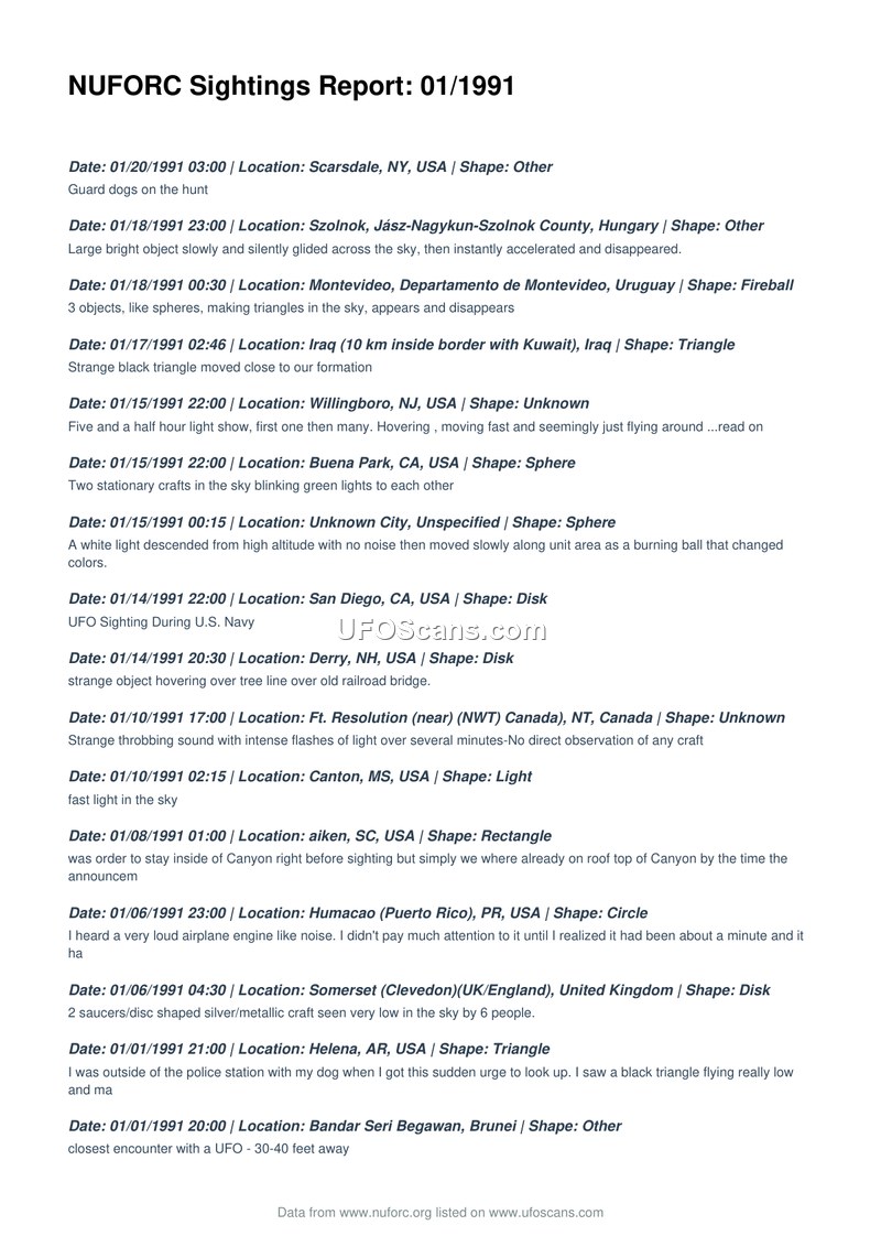 This document is a compilation of UFO sighting reports for the month of January 1991, provided by the National UFO Reporting Center (NUFORC). The report lists 18 distinct incidents occurring between January 1 and January 20, 1991. The sightings are global in nature, with reports originating from the United States, Hungary, Uruguay, Iraq, Canada, the United Kingdom, and Brunei. The reported phenomena vary significantly in description, including objects described as spheres, triangles, disks, rectangles, circles, and lights. Specific behaviors noted by witnesses include hovering, rapid acceleration, silent gliding, and blinking lights. One report from Iraq mentions a black triangle moving near a military formation, while another from San Diego references a sighting during U.S. Navy activity. Other reports describe auditory phenomena, such as loud engine-like noises or throbbing sounds, and one incident in Milford, New Hampshire, is associated with a lightning storm. The document serves as a chronological log of these reported events without providing official analysis or conclusions for the individual sightings.