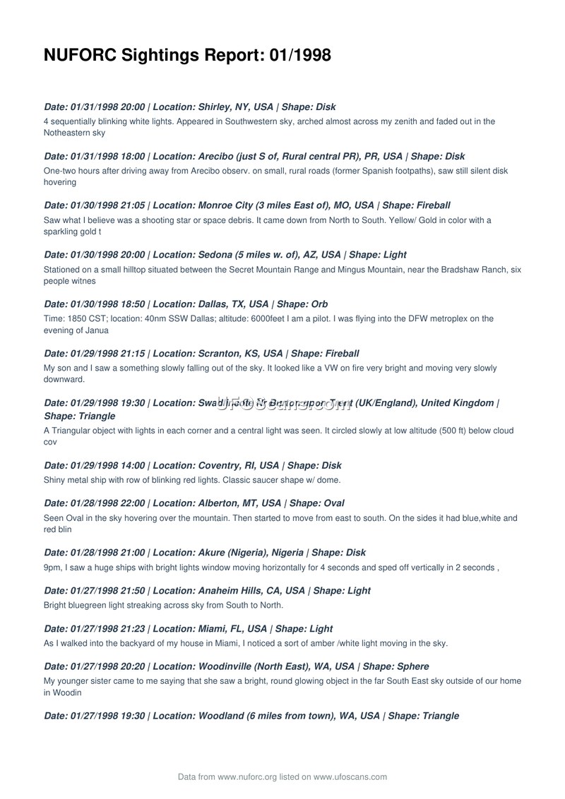 This document is a compilation of UFO sighting reports submitted to the National UFO Reporting Center (NUFORC) for the month of January 1998. The report lists numerous individual accounts from various locations globally, primarily within the United States, but also including sightings in the United Kingdom, Canada, Nigeria, and Australia. The reports describe a wide variety of phenomena, including disks, fireballs, orbs, triangles, spheres, and unidentified lights. Witnesses report diverse behaviors, such as hovering, rapid acceleration, formation flying, and silent movement. Several reports mention specific details, such as the presence of blinking lights, metallic surfaces, and in some instances, interactions with military aircraft or proximity to military installations like Fort Jackson and Cannon Air Force Base. The accounts vary in detail, with some witnesses providing specific times, altitudes, and descriptions of the objects' movements, while others offer more anecdotal observations. The document serves as a raw data repository for these reported events, documenting the subjective experiences of witnesses during this period.
