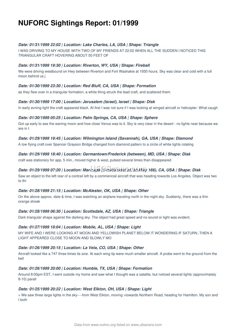 A chronological list of UFO sightings reported to the National UFO Reporting Center during January 1999. The document contains dozens of individual accounts from global witnesses describing various aerial phenomena.