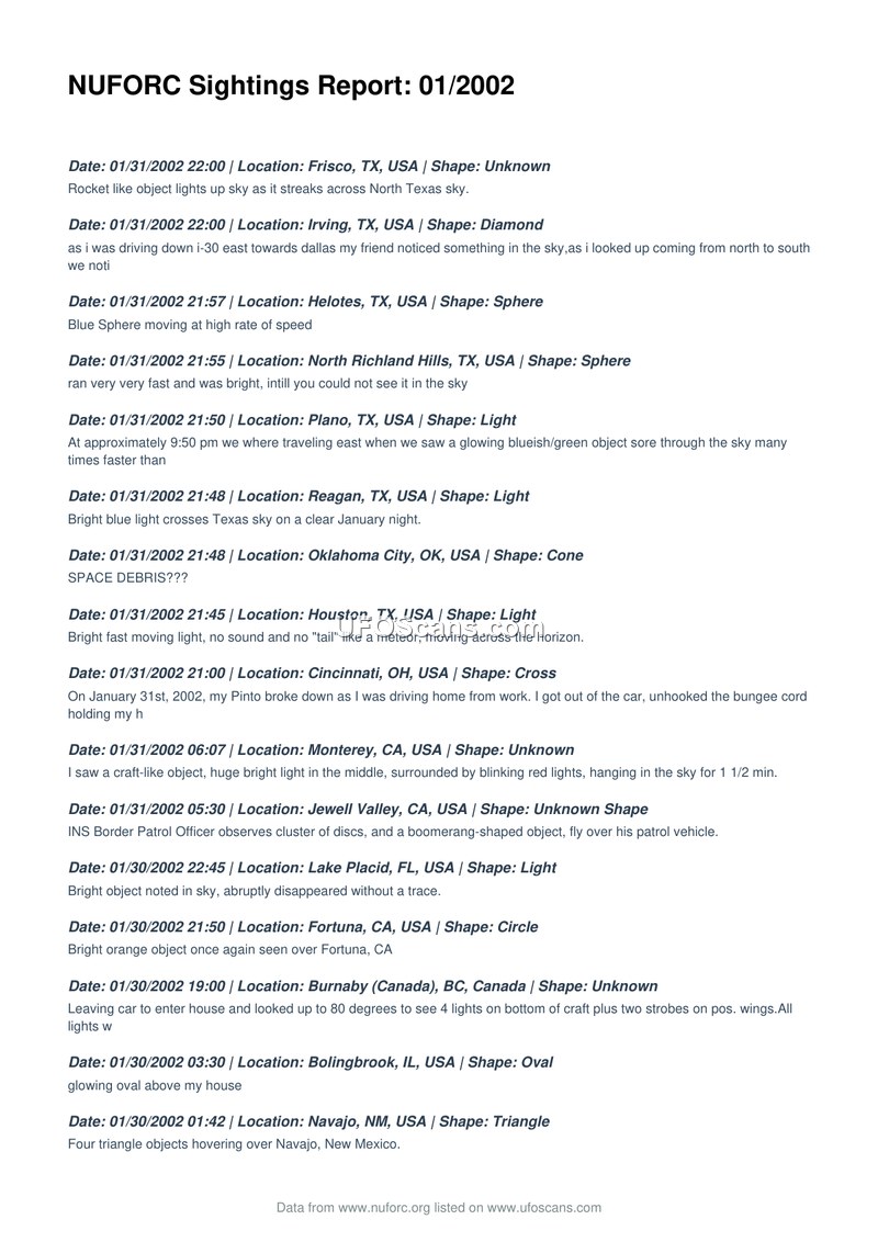 This document is a log of UFO sightings reported to the National UFO Reporting Center during January 2002. It provides a global snapshot of public reports, documenting various shapes, behaviors, and locations of observed aerial phenomena.