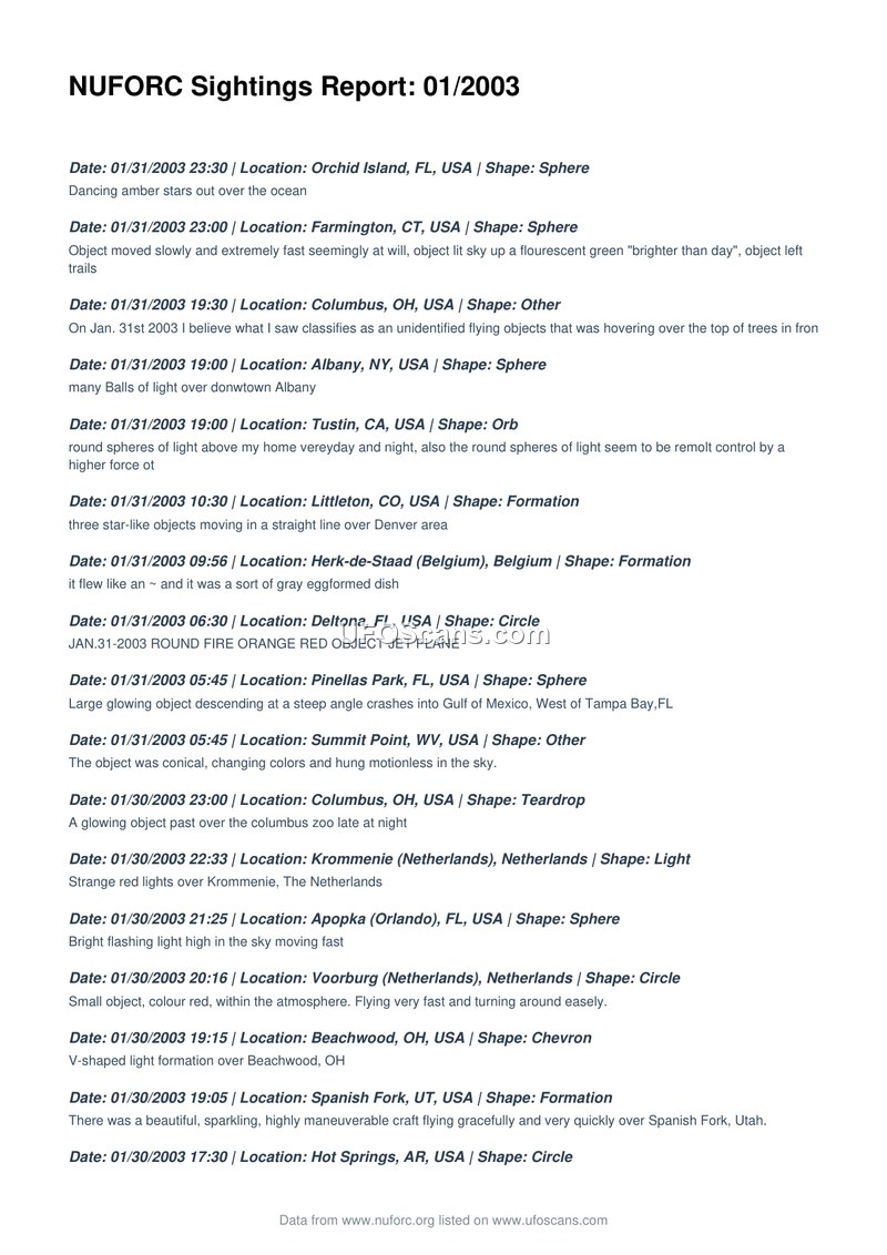 This document is a chronological log of UFO/UAP sightings reported to NUFORC during January 2003. It contains hundreds of individual accounts from global witnesses describing diverse aerial phenomena.