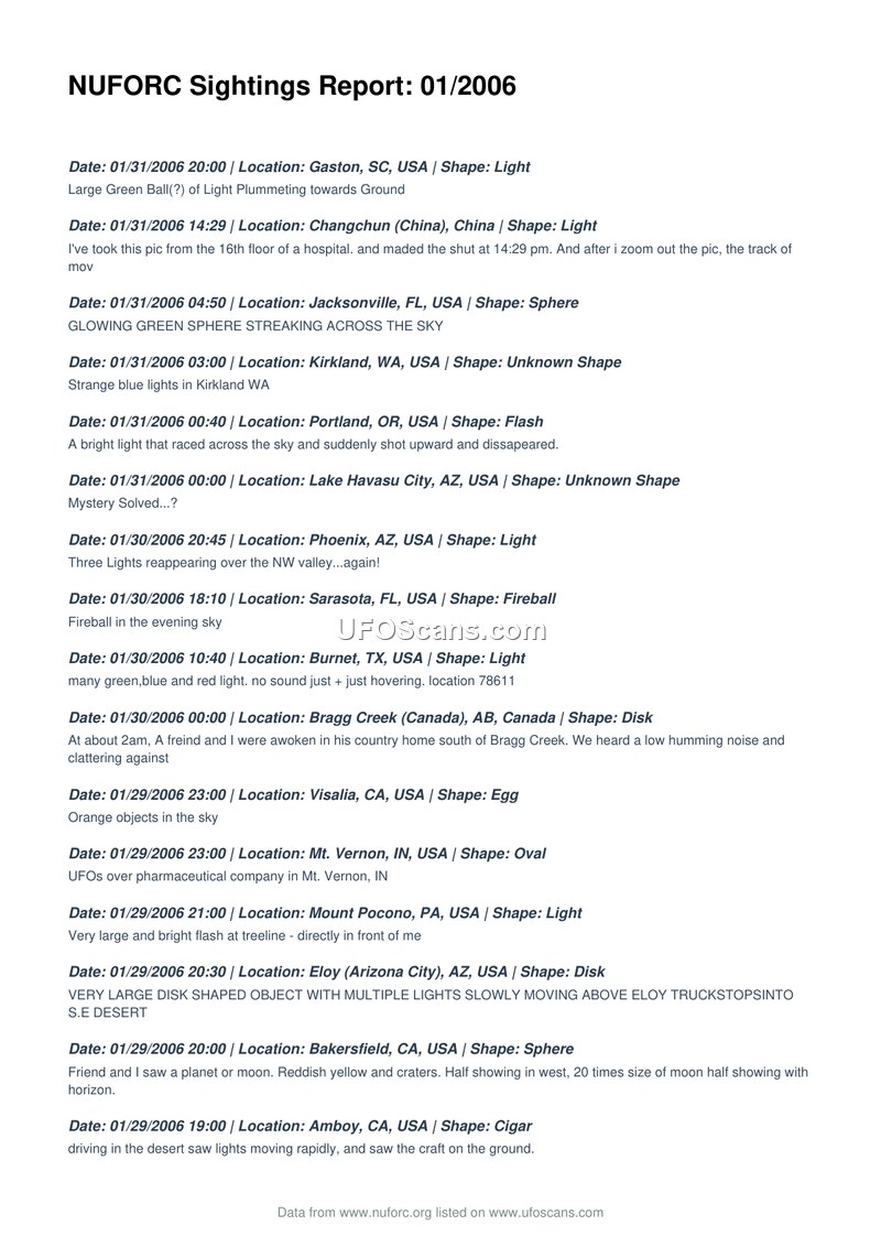 This document is a chronological log of hundreds of UFO/UAP sightings reported to the National UFO Reporting Center during January 2006. It provides a global snapshot of witness accounts, detailing various object shapes, behaviors, and locations.
