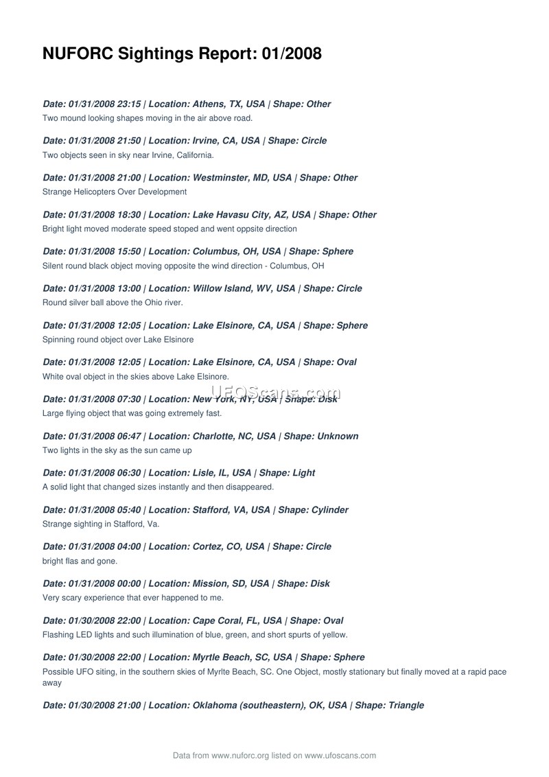 This document is a comprehensive compilation of Unidentified Aerial Phenomena (UAP) sighting reports collected by the National UFO Reporting Center (NUFORC) for the month of January 2008. The report lists hundreds of individual accounts submitted by witnesses from across the United States and various international locations, including the United Kingdom, Canada, Australia, India, Mexico, and others. Each entry provides the date, time, location, and a brief description of the observed object or phenomenon, along with its reported shape. The descriptions vary significantly, ranging from simple lights and fireballs to complex geometric shapes such as triangles, disks, spheres, and cigars. Many witnesses describe erratic flight patterns, high speeds, hovering capabilities, and unusual lighting configurations. Several reports mention the presence of military aircraft or helicopters in the vicinity of the sightings, and some accounts include claims of physical effects, such as power outages or ground traces. The document also includes occasional notes from NUFORC, which offer potential explanations for certain sightings, such as the planet Sirius, party lanterns, or birds in flight, while acknowledging that many other reports remain unexplained. The compilation serves as a raw data repository for public reports of anomalous aerial activity during this specific period.