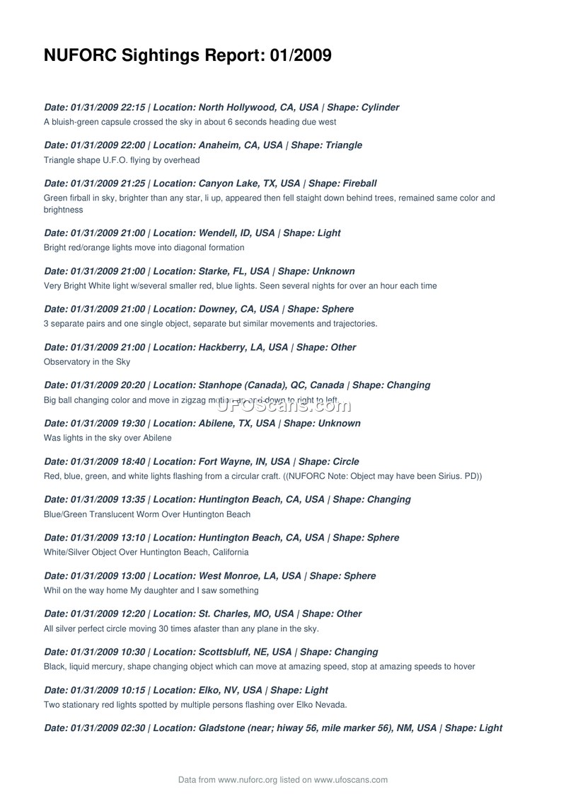 NUFORC Sightings Report: 01/2009