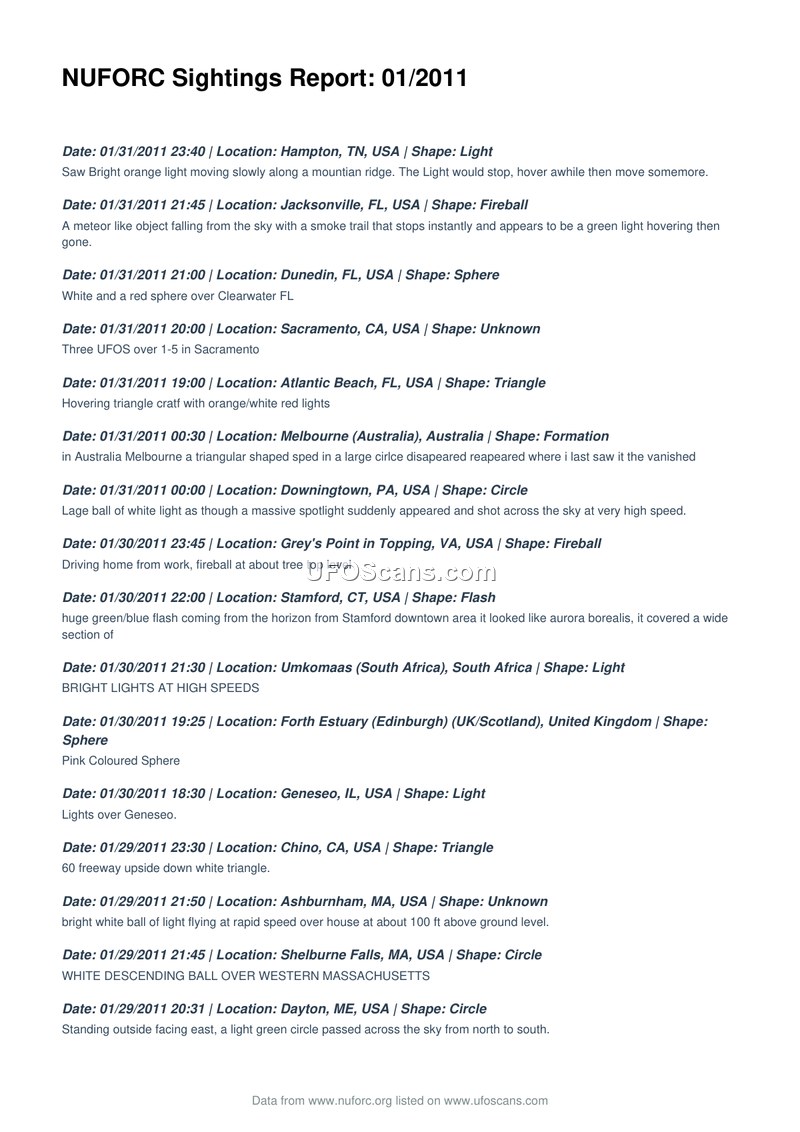 This document is a chronological log of hundreds of UFO/UAP sighting reports submitted to the National UFO Reporting Center in January 2011. It covers global sightings with varied descriptions of object shapes, behaviors, and witness accounts.