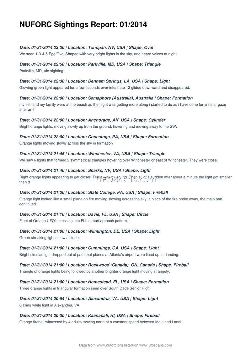 NUFORC Sightings Report: 01/2014