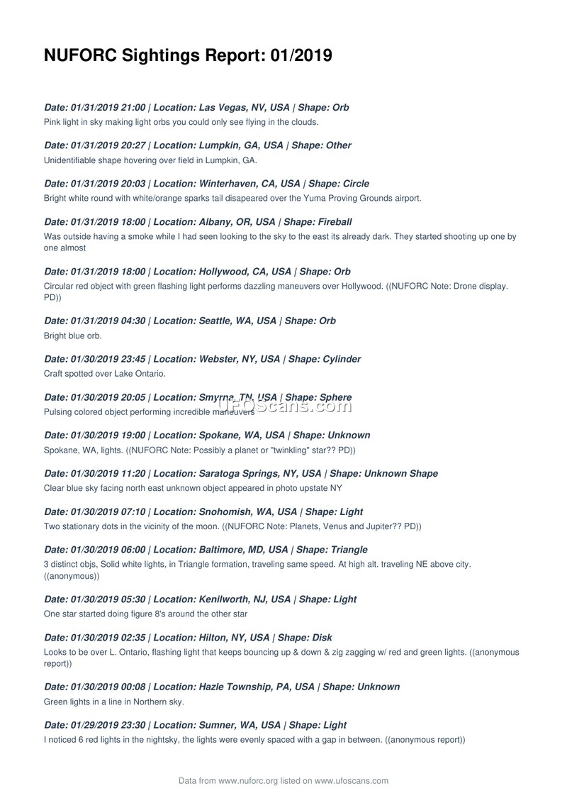 A compilation of hundreds of UFO/UAP sighting reports from January 2019, documented by the National UFO Reporting Center. The reports cover a wide variety of shapes, behaviors, and locations, with occasional notes from investigators suggesting potential conventional explanations.