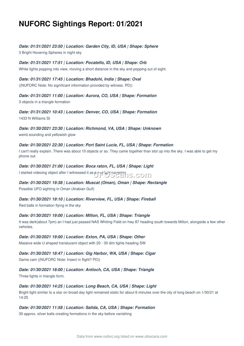 NUFORC Sightings Report: 01/2021