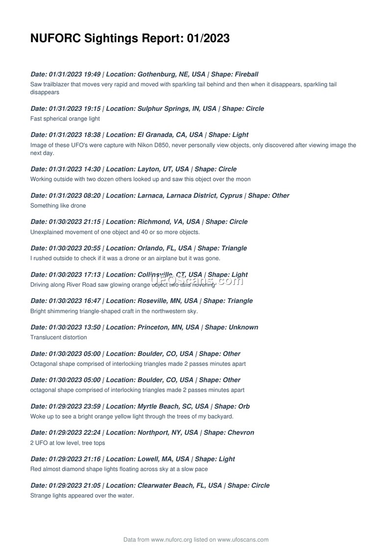 NUFORC Sightings Report: 01/2023