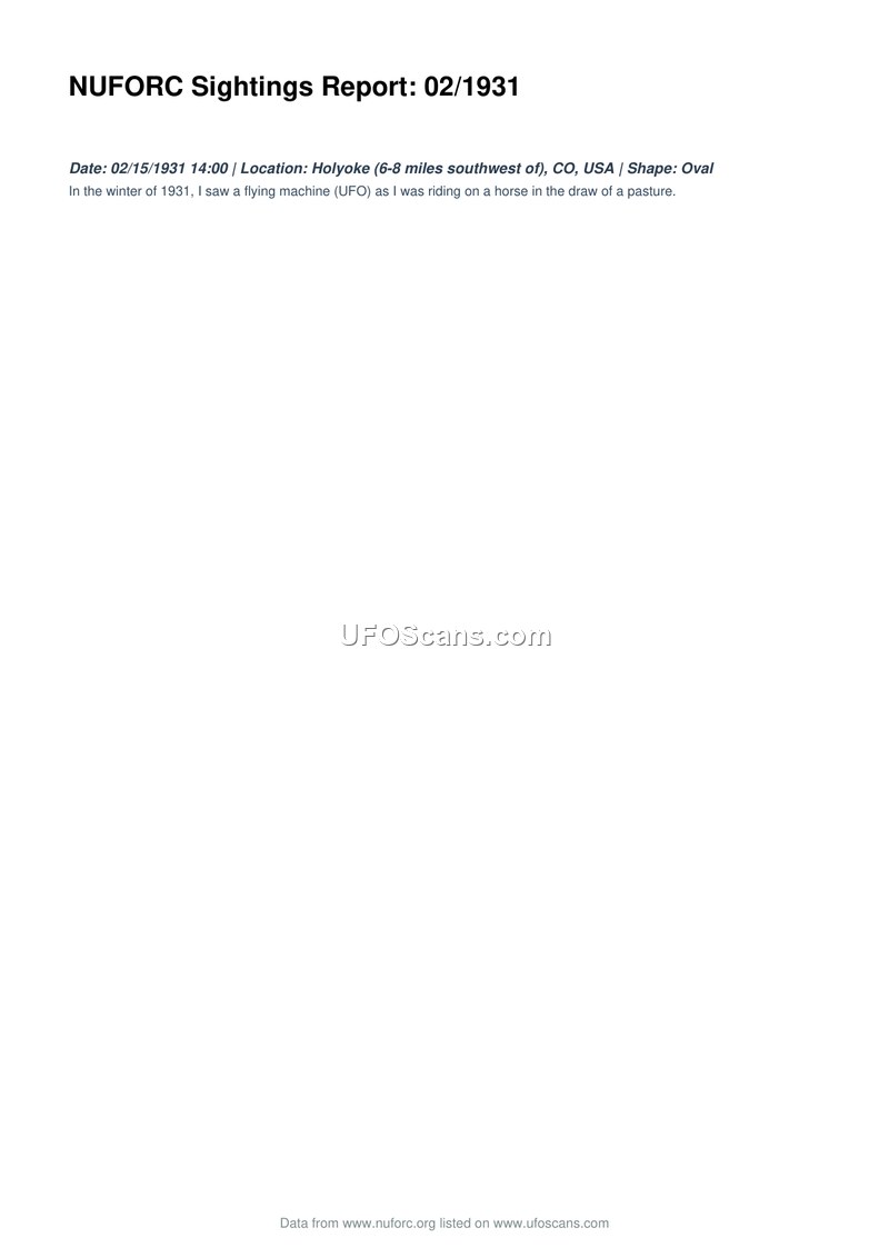 This document is a sighting report compiled by the National UFO Reporting Center (NUFORC) regarding an event that occurred on February 15, 1931, at 14:00. The witness reported observing a flying machine, described as oval in shape, while riding a horse in the draw of a pasture located six to eight miles southwest of Holyoke, Colorado. The report provides a brief, first-hand account of the encounter during the winter of 1931.