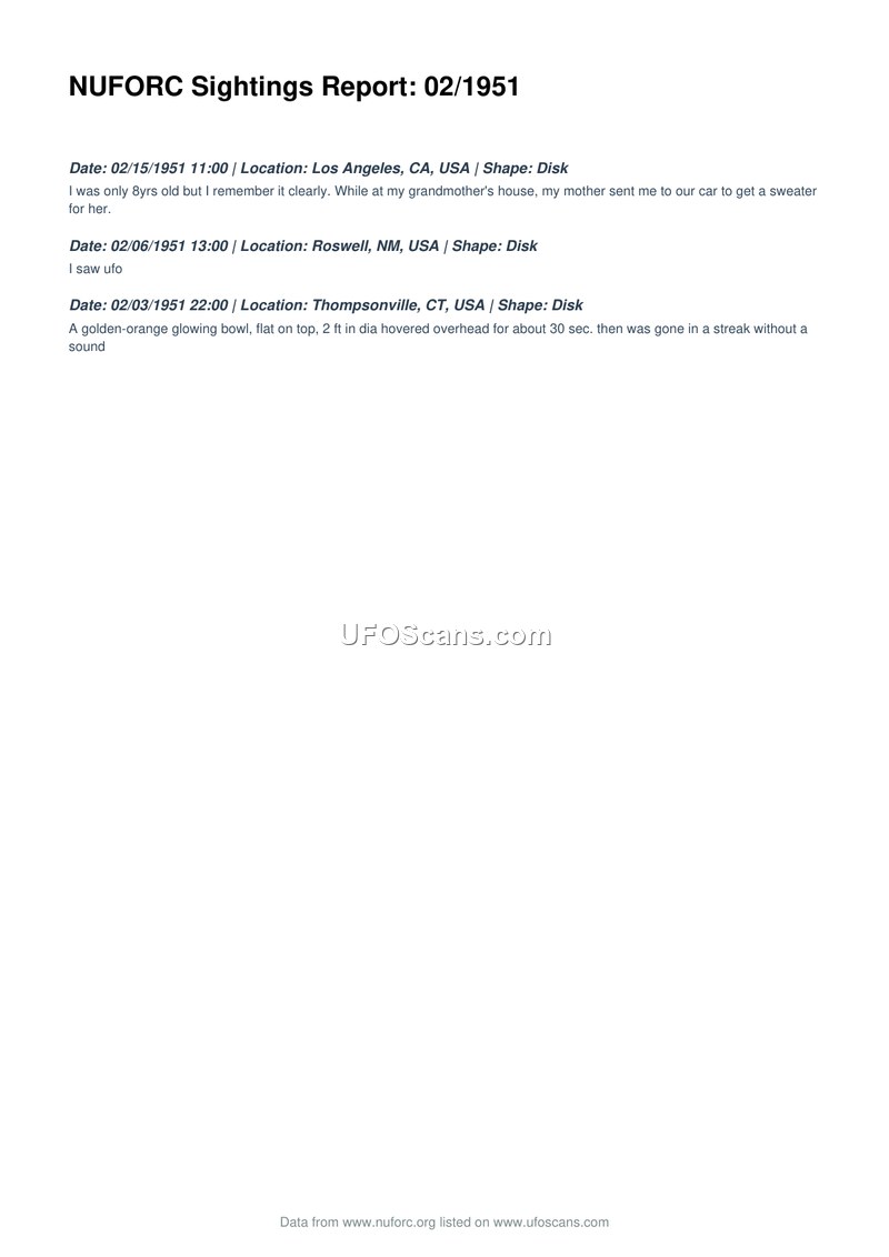 This document, titled 'NUFORC Sightings Report: 02/1951', provides a compilation of three distinct UFO sighting reports occurring in February 1951 within the United States. The first report, dated February 15, 1951, at 11:00, describes a disk-shaped object seen in Los Angeles, California, by a witness who was eight years old at the time. The second report, dated February 6, 1951, at 13:00, involves a disk-shaped object observed in Roswell, New Mexico, with the witness simply stating, 'I saw ufo'. The third report, dated February 3, 1951, at 22:00, details a sighting in Thompsonville, Connecticut. The witness describes a golden-orange glowing bowl, flat on top, measuring two feet in diameter. This object reportedly hovered overhead for approximately 30 seconds before disappearing in a streak without making any sound. All three reported objects were categorized as disk-shaped.