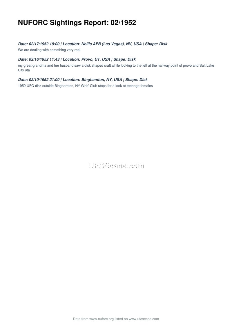 This document, titled 'NUFORC Sightings Report: 02/1952', provides a brief compilation of three unidentified aerial phenomena sightings reported during February 1952 in the United States. The first incident occurred on February 17, 1952, at 18:00 at Nellis AFB in Nevada, where a disk-shaped object was observed. The report includes a brief commentary stating, 'We are dealing with something very real.' The second incident took place on February 16, 1952, at 11:43 in Provo, Utah. In this instance, a witness and her husband observed a disk-shaped craft while traveling between Provo and Salt Lake City. The third incident occurred on February 10, 1952, at 21:00 in Binghamton, New York. This report describes a disk-shaped UFO that stopped outside the Binghamton Girls' Club to observe teenage females. The document serves as a historical record of these specific accounts as compiled by the National UFO Reporting Center.