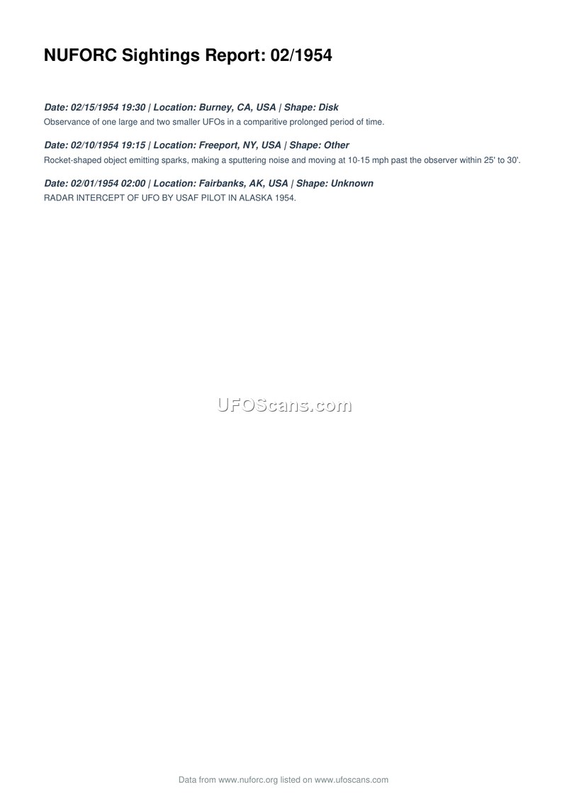 This document lists three UFO sightings from February 1954, including a radar intercept by a USAF pilot in Alaska. It serves as a historical compilation of reports provided by NUFORC.