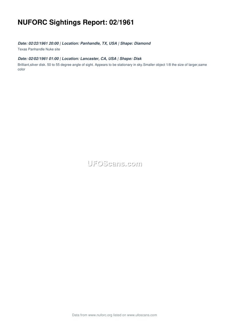 This document, titled 'NUFORC Sightings Report: 02/1961', provides a brief summary of two separate unidentified aerial phenomena sightings recorded in February 1961. The first incident occurred on February 22, 1961, at 20:00 in the Panhandle region of Texas, specifically noted as being near a 'Texas Panhandle Nuke site'. The object observed during this event was described as having a diamond shape. The second incident took place on February 2, 1961, at 01:00 in Lancaster, California. The witness reported observing a brilliant, silver disk that appeared to be stationary in the sky. The report notes a 50 to 55-degree angle of sight and mentions a smaller object that was approximately one-eighth the size of the larger disk and shared the same color. The data is attributed to the National UFO Reporting Center (NUFORC) and was sourced from the ufoscans.com archive.
