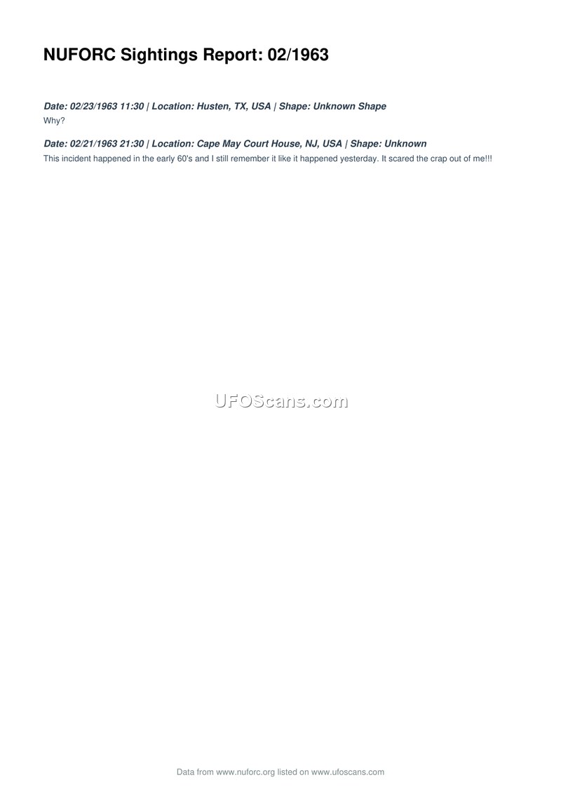 This document is a compilation of two UFO sighting reports from February 1963, sourced from the National UFO Reporting Center (NUFORC). The first incident occurred on February 23, 1963, at 11:30 in Husten, Texas, involving an object of unknown shape. The second incident took place on February 21, 1963, at 21:30 in Cape May Court House, New Jersey. The witness of the New Jersey event describes the experience as having occurred in the early 1960s, noting that the memory remains vivid and that the event was frightening.