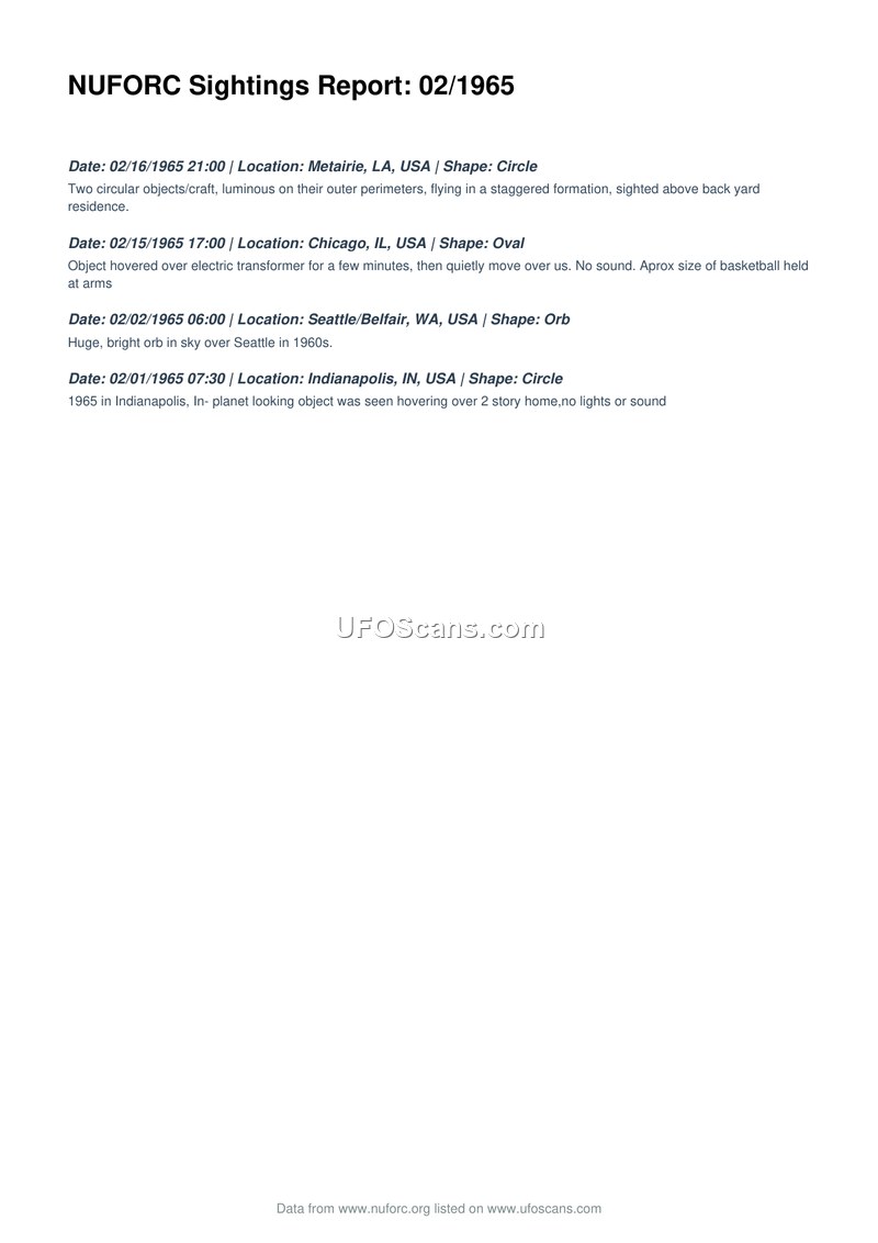 This document, titled 'NUFORC Sightings Report: 02/1965', provides a chronological list of four distinct aerial phenomena sightings reported during February 1965. The first incident occurred on February 16, 1965, in Metairie, Louisiana, where two luminous circular objects were observed in a staggered formation above a residential backyard. On February 15, 1965, in Chicago, Illinois, an oval-shaped object was reported hovering over an electric transformer; the witness noted it was silent and approximately the size of a basketball held at arm's length. A third report from February 2, 1965, describes a huge, bright orb sighted in the sky over Seattle/Belfair, Washington. Finally, on February 1, 1965, in Indianapolis, Indiana, a planet-like object was observed hovering over a two-story home, with the witness noting the absence of lights or sound. The document serves as a compilation of these specific accounts.