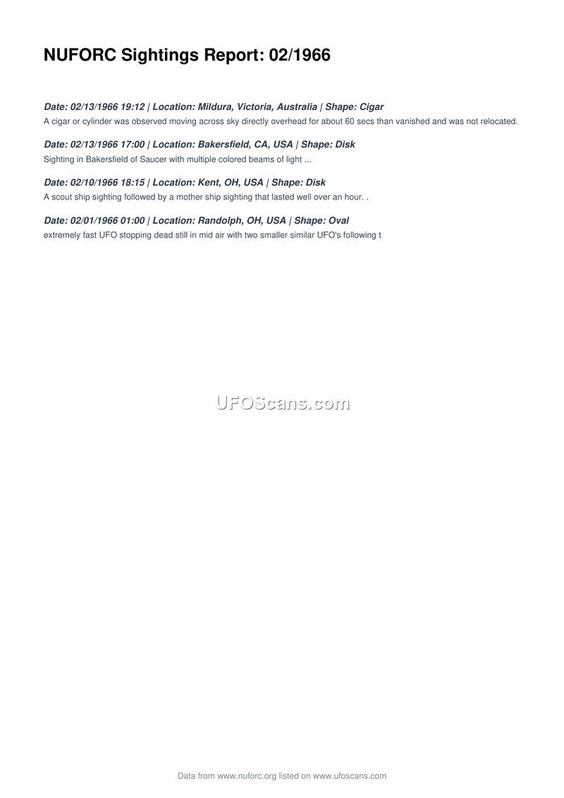 This document is a compilation of four UFO sighting reports from February 1966, sourced from the National UFO Reporting Center (NUFORC). The first incident occurred on February 13, 1966, at 19:12 in Mildura, Victoria, Australia, where a cigar or cylinder-shaped object was observed moving overhead for approximately 60 seconds before vanishing. The second report, also from February 13, 1966, at 17:00, describes a disk-shaped object in Bakersfield, California, USA, associated with multiple colored beams of light. The third report details a sighting in Kent, Ohio, USA, on February 10, 1966, at 18:15, involving a scout ship followed by a mother ship, with the event lasting over an hour. The final report occurred on February 1, 1966, at 01:00 in Randolph, Ohio, USA, involving an oval-shaped object described as extremely fast, which stopped dead in mid-air, accompanied by two smaller similar objects.