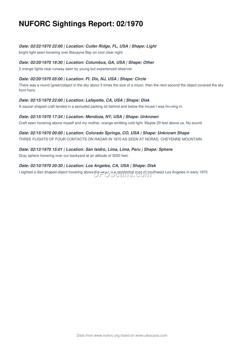 This document is a compilation of Unidentified Aerial Phenomena (UAP) sightings reported to the National UFO Reporting Center (NUFORC) for the month of February 1970. The report lists eight distinct incidents occurring between February 10 and February 22, 1970. The sightings span various locations, including Cutler Ridge, Florida; Columbus, Georgia; Ft. Dix, New Jersey; Lafayette, California; Mendoza, New York; Colorado Springs, Colorado; San Isidro, Lima, Peru; and Los Angeles, California. The reported phenomena vary in description, ranging from lights and spheres to disc-shaped and circular craft. Notable details include a report of a round green object at Ft. Dix that appeared to cover the sky, a saucer-shaped craft landing in a secluded parking lot in Lafayette, and a radar observation at NORAD in Cheyenne Mountain involving three flights of four contacts. The document also notes a sighting in Peru involving a gray sphere at an altitude of 3000 feet and a disc-shaped object observed in Los Angeles. The reports are presented as brief summaries of witness accounts, with one instance noting the observer was 'young but experienced' and another mentioning the presence of a mother during the sighting.