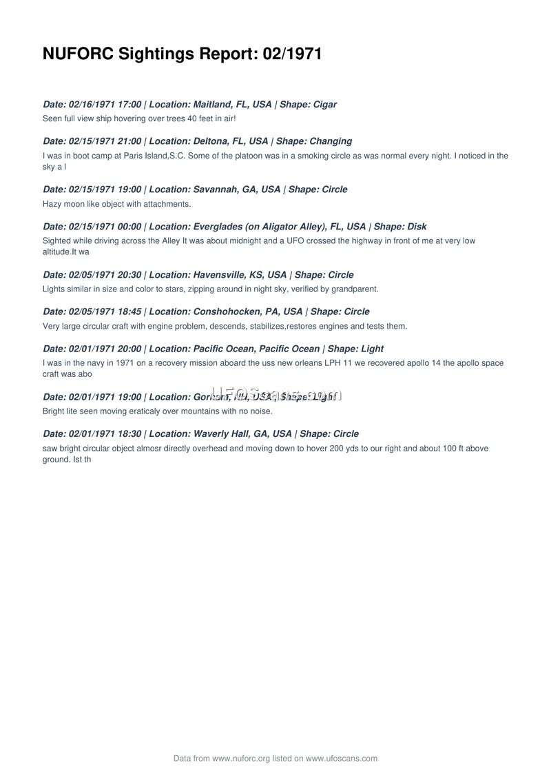 This document is a compilation of UFO sighting reports for the month of February 1971, sourced from the National UFO Reporting Center (NUFORC). It lists nine distinct incidents occurring across the United States and the Pacific Ocean. The reports describe various aerial phenomena, including a cigar-shaped ship hovering over trees in Maitland, Florida; a changing object observed by a witness in boot camp at Parris Island, South Carolina; a hazy, moon-like object with attachments in Savannah, Georgia; and a disk-shaped object crossing a highway in the Everglades, Florida. Other reports include lights resembling stars moving in the night sky in Havensville, Kansas; a large circular craft experiencing engine trouble in Conshohocken, Pennsylvania; a light observed during an Apollo 14 recovery mission by the USS New Orleans in the Pacific Ocean; a bright light moving erratically over mountains in Gorham, New Hampshire; and a bright circular object hovering near Waverly Hall, Georgia. The document serves as a chronological record of these civilian-reported events.