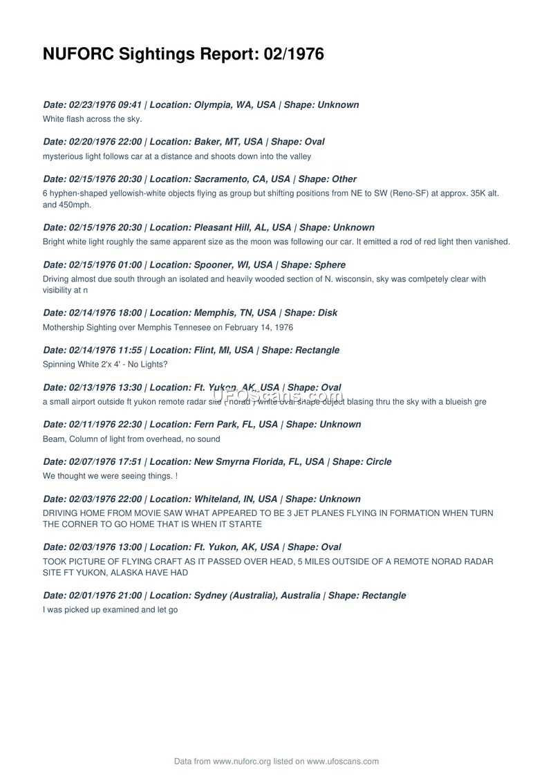 This document provides a chronological list of thirteen UFO sightings reported to NUFORC in February 1976. It includes diverse accounts of aerial phenomena across the United States and Australia, some involving proximity to NORAD radar sites.