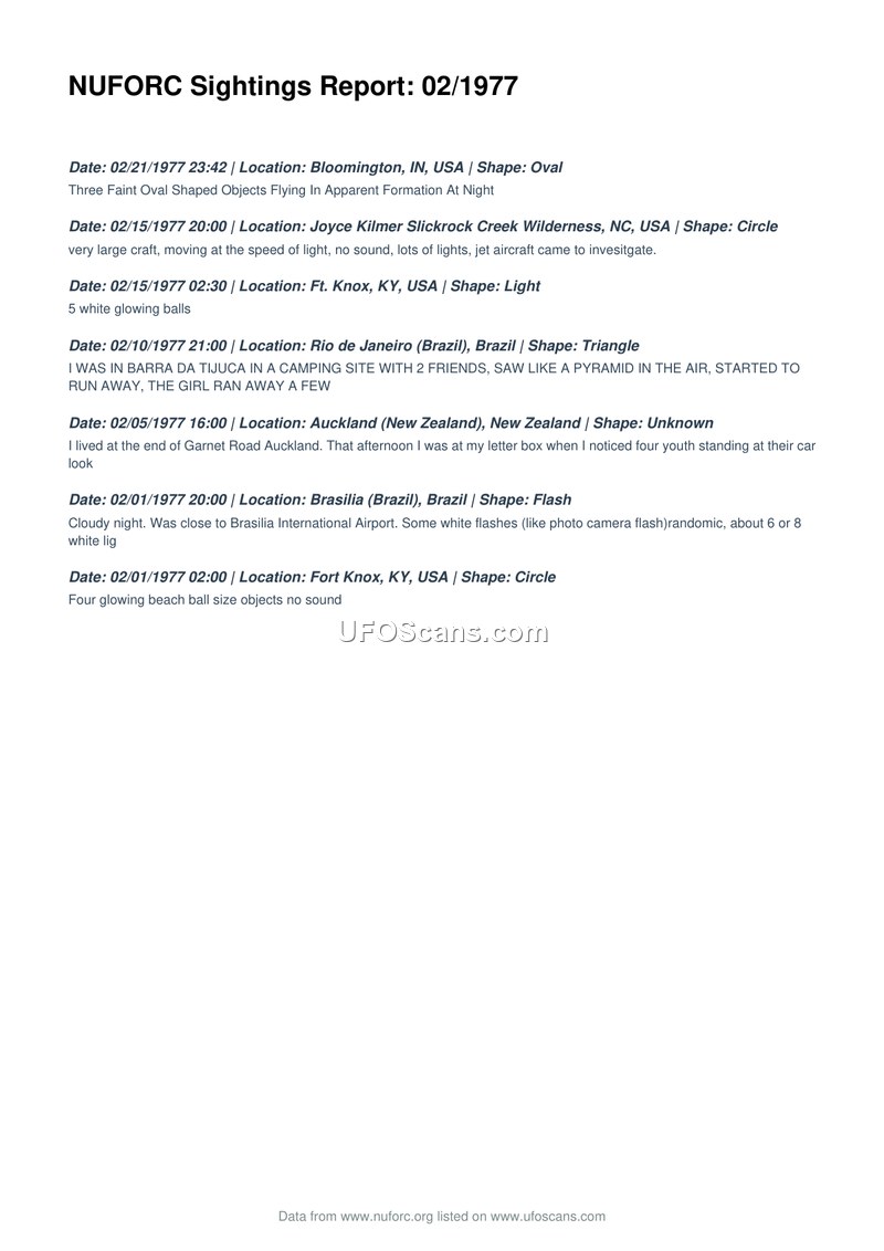 This document is a summary report from the National UFO Reporting Center (NUFORC) detailing seven distinct sighting incidents that occurred during February 1977. The reports span various international locations, including the United States, Brazil, and New Zealand. The sightings describe a variety of phenomena, ranging from oval-shaped objects in Bloomington, Indiana, to a large, silent, light-emitting craft in the Joyce Kilmer Slickrock Creek Wilderness of North Carolina, which reportedly prompted an investigation by jet aircraft. Other reports include white glowing balls at Fort Knox, Kentucky; a pyramid-shaped object observed by campers in Barra da Tijuca, Brazil; and unidentified flashes near the Brasilia International Airport. The document also notes an incident in Auckland, New Zealand, involving youth near a vehicle, and a final report of glowing, beach-ball-sized objects in Fort Knox, Kentucky. The report serves as a chronological log of these events as compiled by NUFORC.