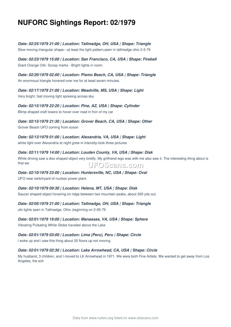 This document is a compilation of UFO sightings reported to the National UFO Reporting Center (NUFORC) for the month of February 1979. It lists fourteen distinct incidents occurring between February 1st and February 25th, 1979. The reports span various locations, primarily within the United States, including Tallmadge, Ohio; San Francisco, California; Pismo Beach, California; Meadville, Mississippi; Pine, Arizona; Grover Beach, California; Alexandria, Virginia; Louden County, Virginia; Huntersville, North Carolina; Helena, Montana; Manassas, Virginia; and Lake Arrowhead, California. One international report from Lima, Peru, is also included. The shapes reported include triangles, fireballs, cylinders, disks, ovals, spheres, and circles. Specific details vary by report, ranging from a 'giant orange orb' with 'scoop marks' in San Francisco to a 'vibrating pulsating white globe' in Manassas, Virginia. Some witnesses reported taking photographs, while others noted the proximity of the objects to landmarks such as nuclear power plants, lakes, or mountain peaks. The document serves as a chronological log of these civilian-reported phenomena.
