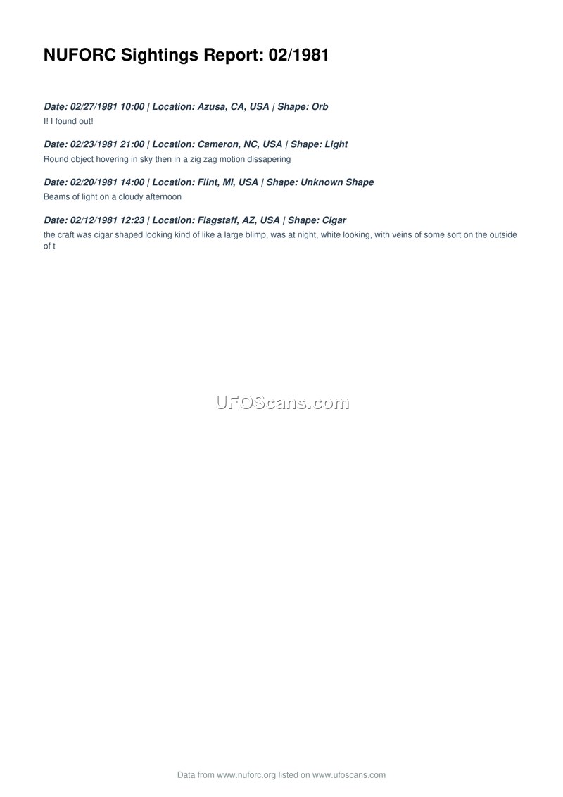 This document, titled 'NUFORC Sightings Report: 02/1981', provides a chronological list of four distinct aerial phenomena sightings reported during February 1981 within the United States. The first entry, dated February 27, 1981, at 10:00 in Azusa, California, describes an orb-shaped object. The second entry, from February 23, 1981, at 21:00 in Cameron, North Carolina, reports a round object that hovered in the sky before disappearing in a zig-zag motion. The third entry, dated February 20, 1981, at 14:00 in Flint, Michigan, notes beams of light observed on a cloudy afternoon. The final entry, dated February 12, 1981, at 12:23 in Flagstaff, Arizona, describes a cigar-shaped craft, likened to a large blimp, observed at night. The witness noted the object appeared white and featured veins of some sort on its exterior. The document serves as a summary compilation of these reports, citing data from the National UFO Reporting Center (NUFORC).