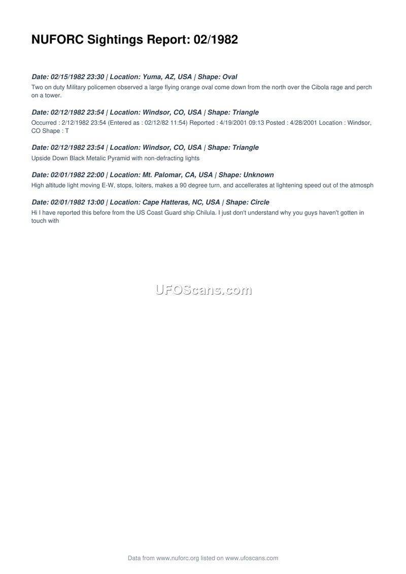 This document is a compilation of five distinct UFO sighting reports occurring in February 1982, as recorded by the National UFO Reporting Center (NUFORC). The reports span various locations across the United States, including Yuma, Arizona; Windsor, Colorado; Mount Palomar, California; and Cape Hatteras, North Carolina. The sightings describe a variety of phenomena, ranging from an orange oval observed by military police in Yuma to a black metallic pyramid in Windsor, and high-altitude lights performing complex maneuvers near Mount Palomar. One report from Cape Hatteras includes a personal note from a witness who claims to have previously reported the incident from the US Coast Guard ship Chilula. The document serves as a historical record of these reported events, providing dates, times, locations, and brief descriptions of the observed objects.