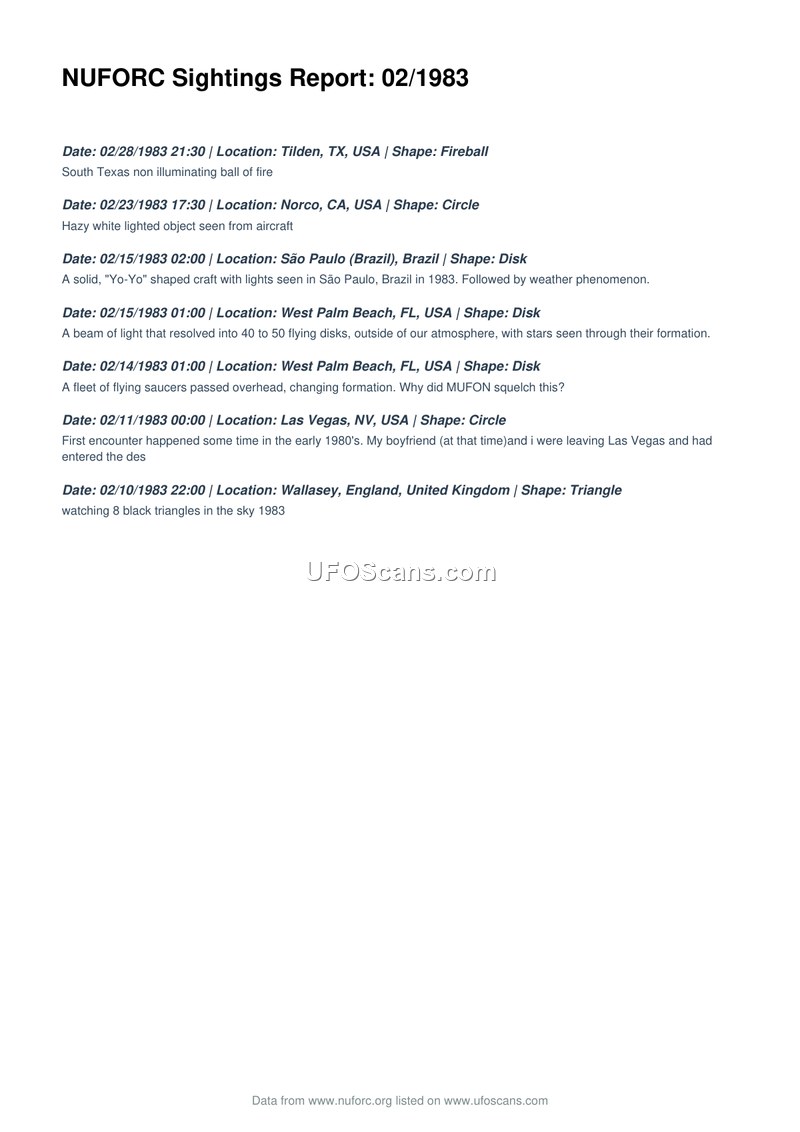 This document is a compilation of UFO sightings reported to the National UFO Reporting Center (NUFORC) for the month of February 1983. The report lists seven distinct incidents occurring between February 10 and February 28, 1983. The sightings span various international locations, including Tilden, Texas; Norco, California; São Paulo, Brazil; West Palm Beach, Florida; Las Vegas, Nevada; and Wallasey, England. The reported phenomena include a variety of shapes, such as fireballs, circles, disks, and triangles. Specific descriptions provided by witnesses include a 'Yo-Yo' shaped craft in Brazil, a fleet of flying saucers in Florida, and a sighting of eight black triangles in England. One entry notes a personal encounter near Las Vegas, while another entry questions the transparency of the Mutual UFO Network (MUFON) regarding a sighting in West Palm Beach. The document serves as a historical record of these reported events as archived by NUFORC.