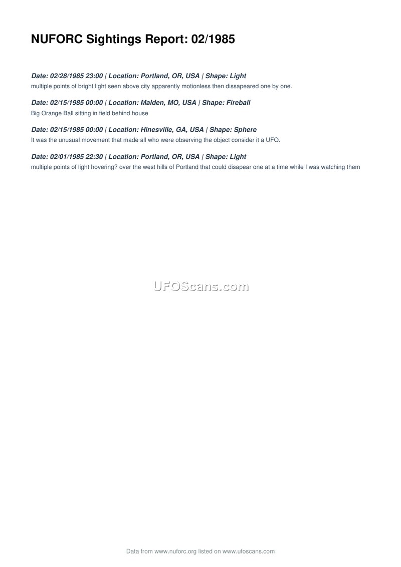 This document lists four distinct UFO sighting reports from February 1985 in Portland, OR; Malden, MO; and Hinesville, GA. It serves as a historical record of civilian-reported aerial phenomena.