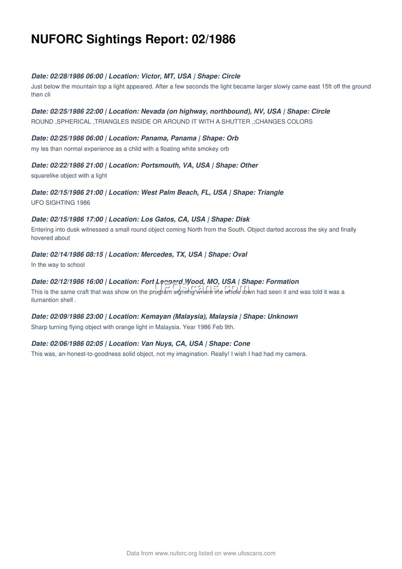 This document is a compilation of ten UFO sightings reported to the National UFO Reporting Center (NUFORC) during February 1986. The reports span various locations, including the United States (Montana, Nevada, Virginia, Florida, California, Texas, Missouri) and Malaysia. The sightings describe a variety of shapes, including circles, orbs, triangles, disks, ovals, formations, and cones. Witness accounts range from brief descriptions of lights and shapes to more detailed observations, such as a solid object in Van Nuys, California, and a craft in Fort Leonard Wood, Missouri, that was allegedly identified by others as an illumination shell. The document serves as a chronological record of these civilian reports, providing dates, times, locations, and brief descriptions of the phenomena observed.