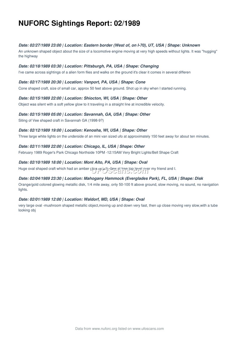 This document is a log of ten UFO sightings reported to NUFORC in February 1989 across the United States. It provides brief descriptions of the objects, locations, and times for each incident.