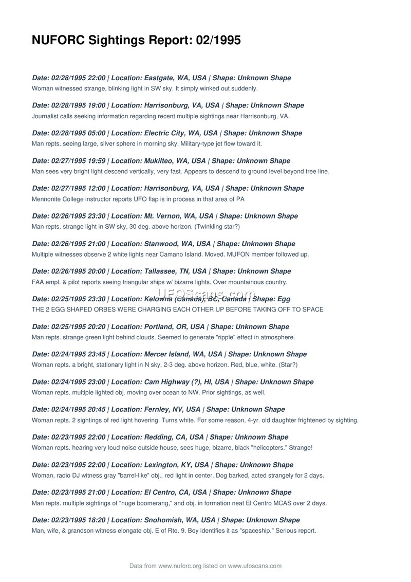 This document is a monthly log of UFO sightings reported to the National UFO Reporting Center in February 1995. It documents a high volume of diverse aerial phenomena reported globally by various witnesses.