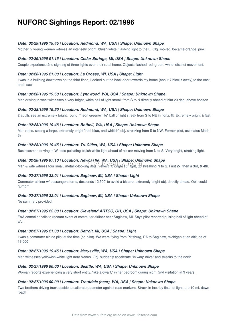 This document is a chronological log of UFO sightings reported to the National UFO Reporting Center during February 1996. It includes diverse accounts from global witnesses, including aviation professionals, describing various aerial phenomena.