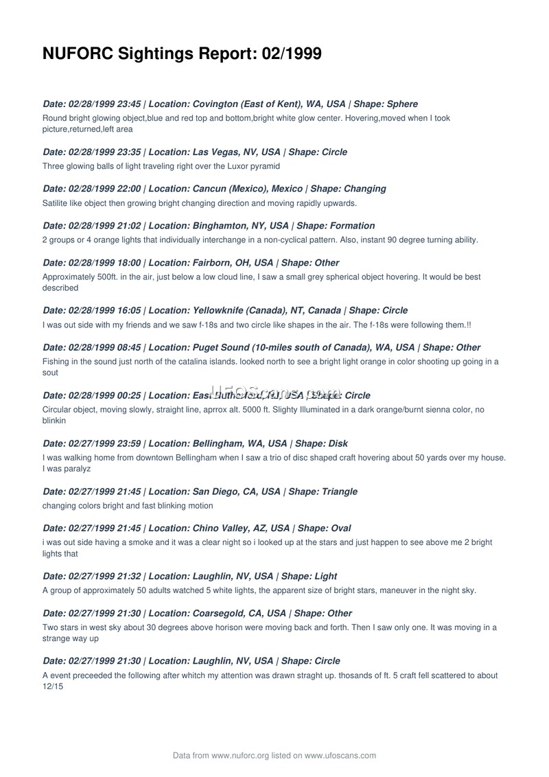 This document is a monthly compilation of UFO/UAP sighting reports from February 1999, aggregated by the National UFO Reporting Center. It provides a chronological list of witness accounts from around the world, detailing various shapes, behaviors, and characteristics of observed aerial phenomena.