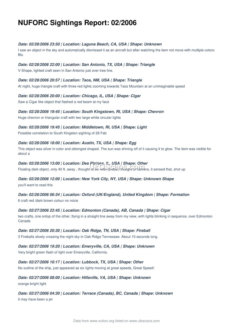 This document is a monthly compilation of UAP sighting reports submitted to the National UFO Reporting Center in February 2006. It provides a chronological list of hundreds of witness accounts from around the world, documenting various shapes, behaviors, and characteristics of observed phenomena.