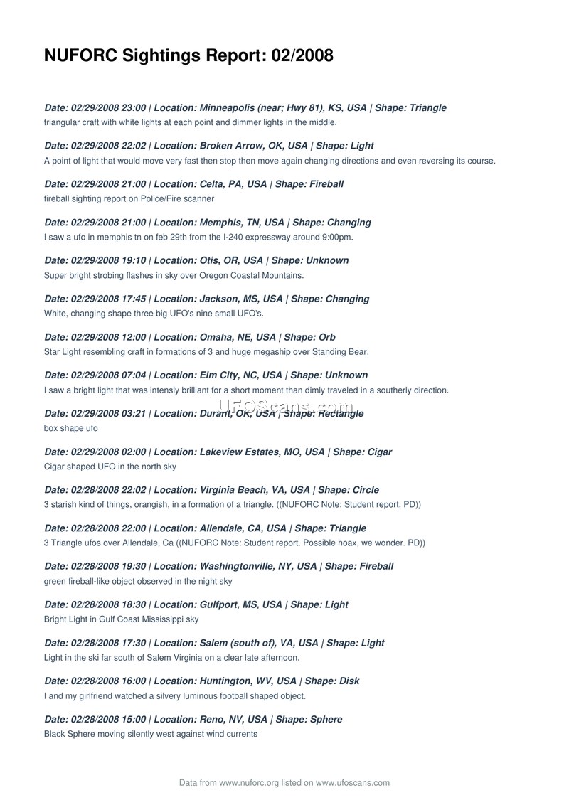 NUFORC Sightings Report: 02/2008