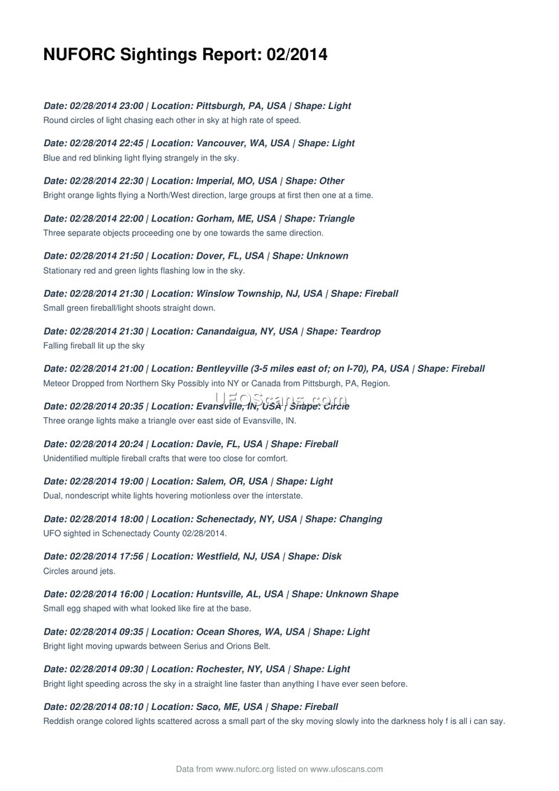 This document is a monthly compilation of hundreds of UAP sighting reports submitted to the National UFO Reporting Center in February 2014. It provides a chronological record of witness accounts detailing various aerial phenomena observed globally.