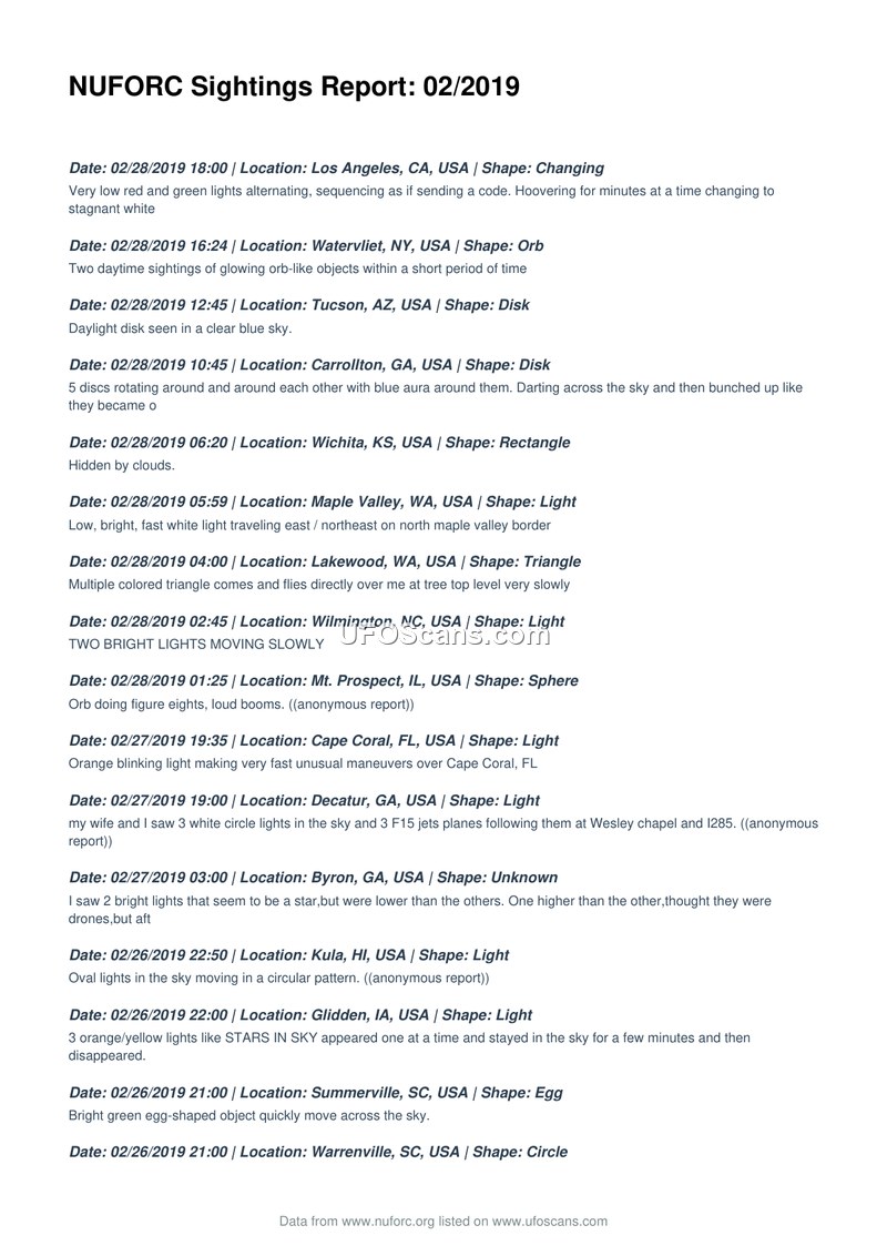 This document is a monthly compilation of UFO sighting reports for February 2019, aggregated by the National UFO Reporting Center (NUFORC). It provides a chronological list of witness accounts from around the world, detailing various shapes, behaviors, and locations of reported UAP.