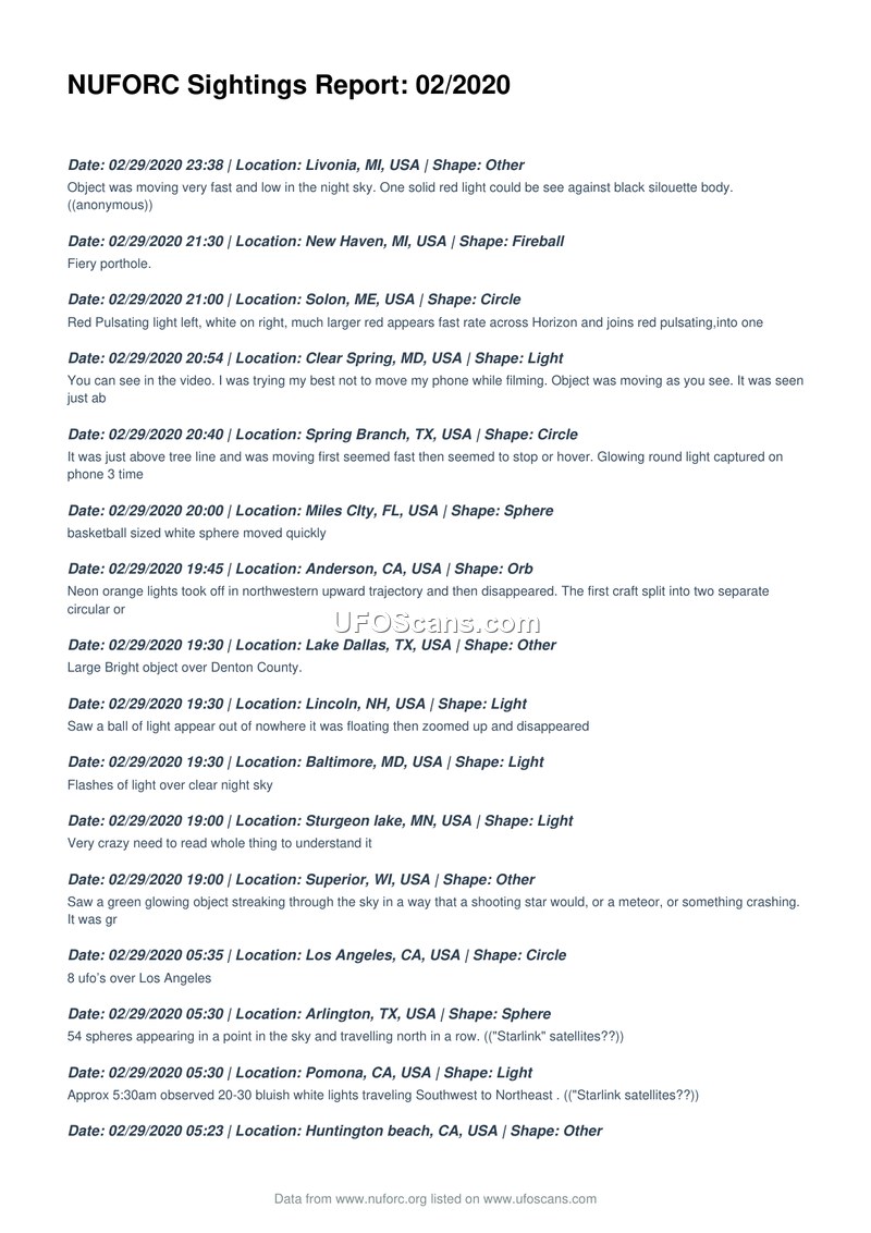 This document is a comprehensive compilation of Unidentified Aerial Phenomena (UAP) sighting reports submitted to the National UFO Reporting Center (NUFORC) during the month of February 2020. The reports span a wide geographic area, primarily within the United States, but also including sightings from Canada, the United Kingdom, France, the Philippines, Costa Rica, Mexico, South Africa, and Australia. The sightings are presented in reverse chronological order, beginning with reports from February 29, 2020, and concluding with reports from February 1, 2020. The descriptions provided by witnesses are diverse, ranging from simple 'lights' and 'spheres' to more complex shapes such as triangles, cigars, disks, and boomerangs. Many reports describe objects moving in formation, often in straight lines, which frequently led witnesses to speculate about the involvement of 'Starlink' or 'Spacelink' satellites. Other reports detail erratic movements, sudden disappearances, and hovering behavior. Several entries mention the use of MADAR (Multiple Anomaly Detection and Assessment Response) nodes, indicating a technical monitoring component to some of the data collection. Some reports include anecdotal details, such as witnesses feeling terrified, objects following vehicles, or objects appearing to interact with military aircraft. The document also includes occasional editorial notes from NUFORC, which suggest potential conventional explanations for certain sightings, such as the planet Venus or satellite constellations. The reports vary significantly in detail, with some providing specific times, locations, and descriptive narratives, while others are brief or mention that video or photographic evidence was captured. The compilation serves as a raw data repository for public-submitted accounts of aerial anomalies during this specific timeframe.