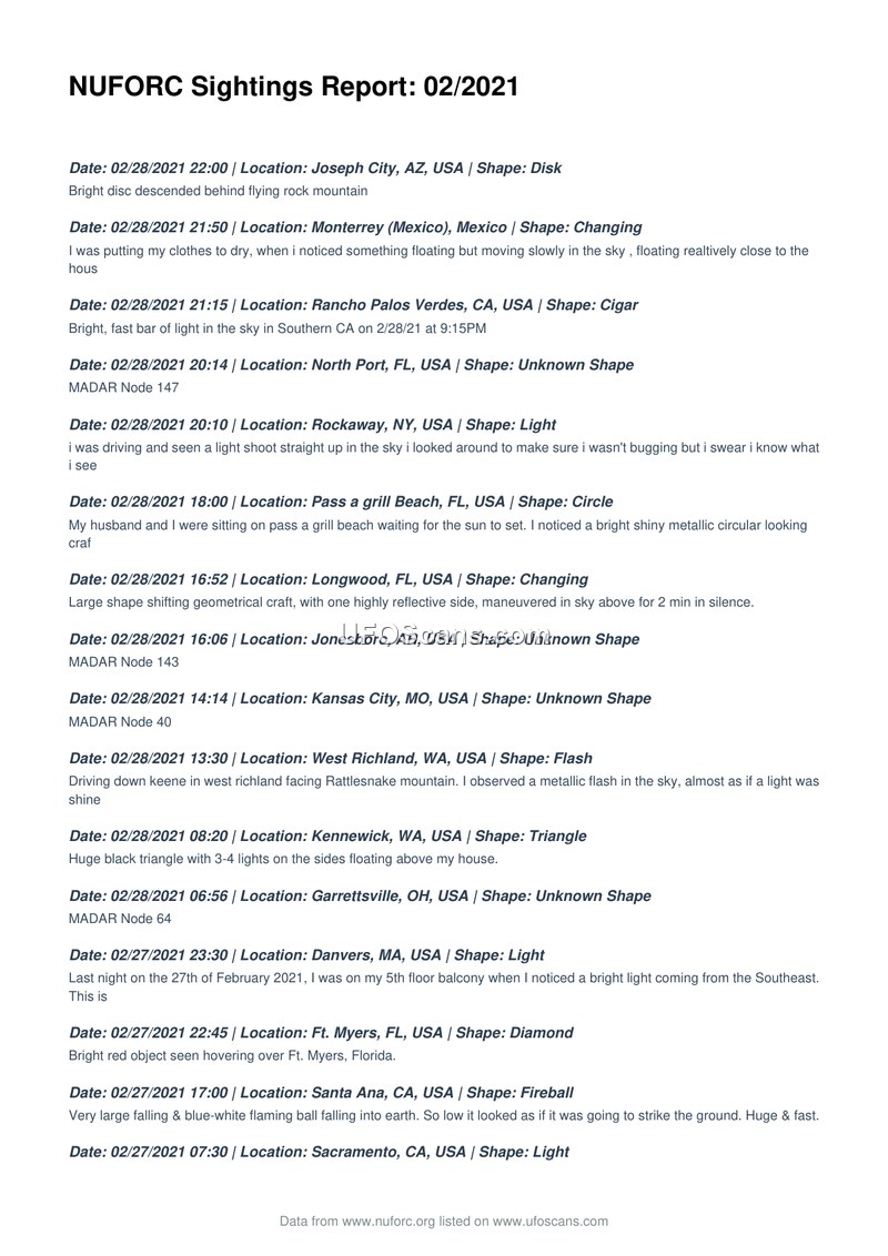 NUFORC Sightings Report: 02/2021
