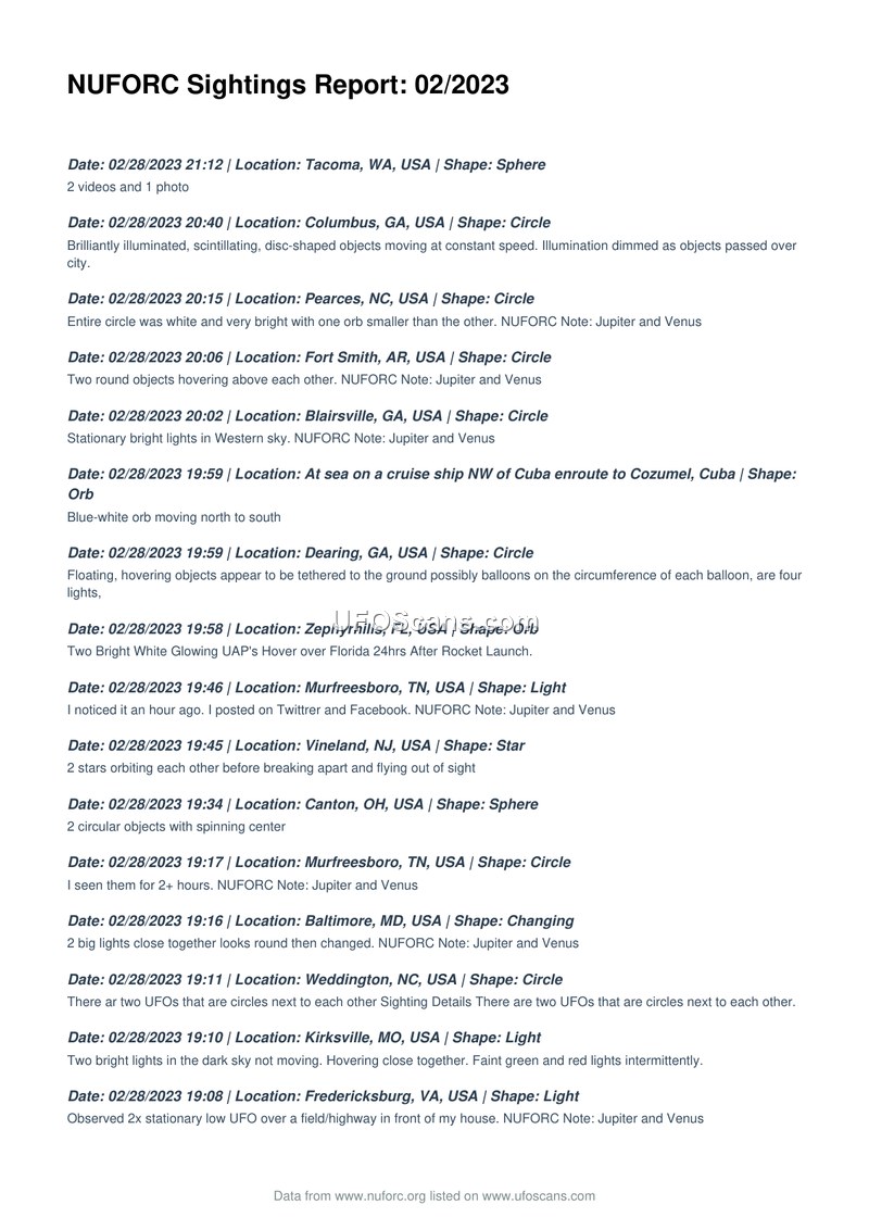 This document is a comprehensive compilation of UFO and UAP sighting reports submitted to the National UFO Reporting Center (NUFORC) for the month of February 2023. The report consists of a chronological list of individual sightings spanning from February 1, 2023, through February 28, 2023. Each entry provides the date and time of the incident, the location, and the reported shape of the object. Many entries include brief, first-hand descriptions of the phenomena observed by witnesses. The reports originate from various locations globally, with a heavy concentration in the United States, but also including sightings in Canada, the United Kingdom, Australia, Mexico, Spain, Finland, and Cyprus. The shapes reported are highly diverse, including spheres, circles, orbs, triangles, cylinders, cigars, fireballs, diamonds, and various lights or formations. Witness descriptions often detail erratic movements, hovering, rapid acceleration, and unusual lighting patterns. In several instances, NUFORC has appended notes to specific sightings, frequently identifying the objects as the planets Jupiter and Venus. Other reports mention specific contexts, such as sightings occurring near rocket launches, military aircraft, or airports. Some witnesses describe physical or physiological experiences, such as feeling weak, observing burn marks on the ground, or detecting radiation. The document serves as a raw data repository for public reports of unidentified aerial phenomena during this specific timeframe, reflecting the subjective experiences and observations of the reporting individuals.