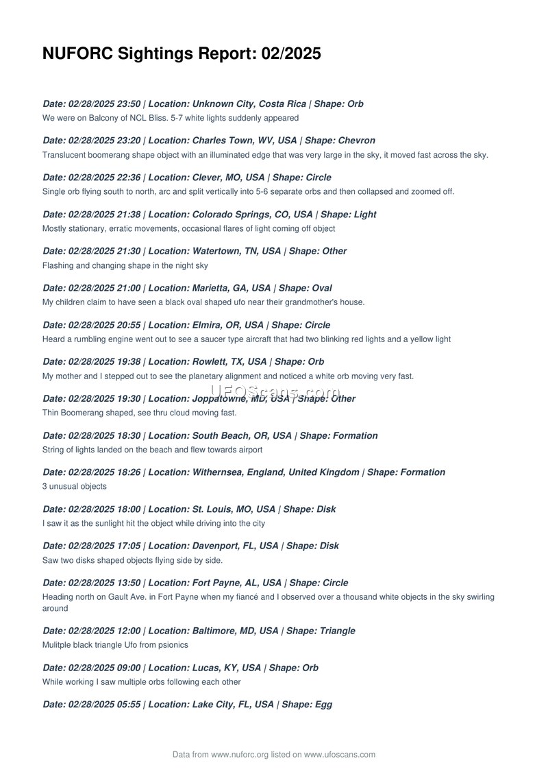 This document is a chronological compilation of hundreds of individual UAP sighting reports submitted to the National UFO Reporting Center during February 2025. It provides a global snapshot of diverse aerial phenomena reported by the public, ranging from simple lights to complex craft.