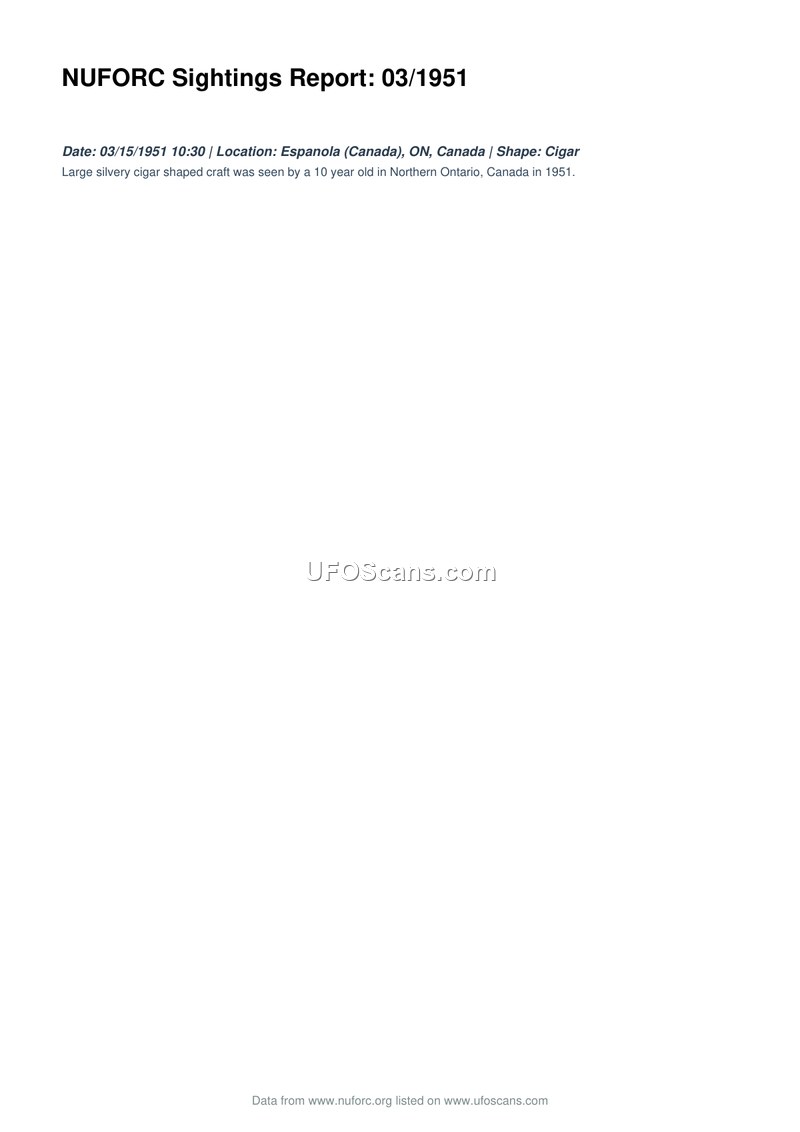 This document is a sighting report compiled by the National UFO Reporting Center (NUFORC) regarding an event that occurred on March 15, 1951, at 10:30. The incident took place in Espanola, Ontario, Canada. According to the report, a 10-year-old witness observed a large, silvery, cigar-shaped craft in the sky over Northern Ontario. No further details regarding the behavior, duration, or physical evidence associated with the object are provided in the text.